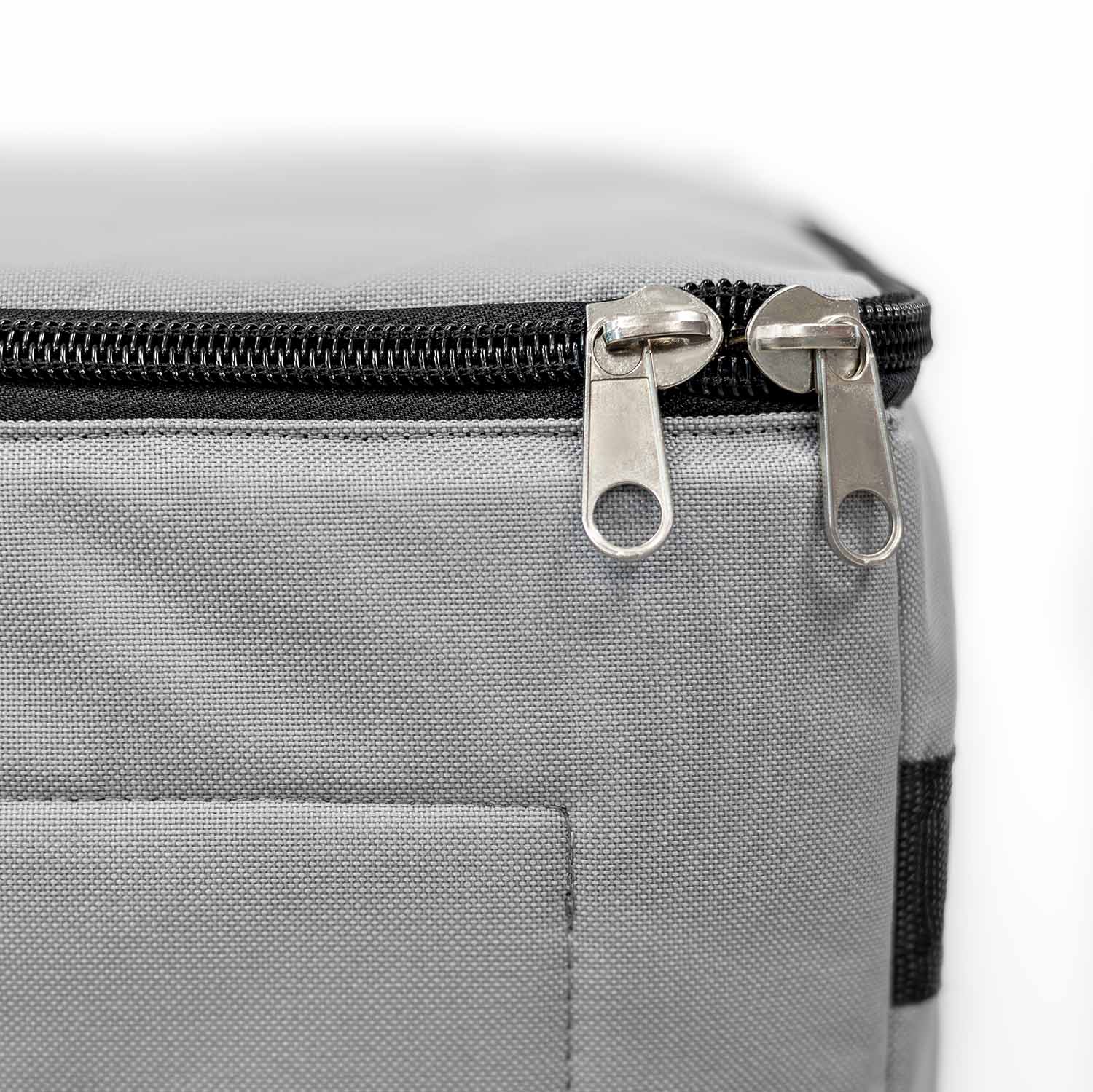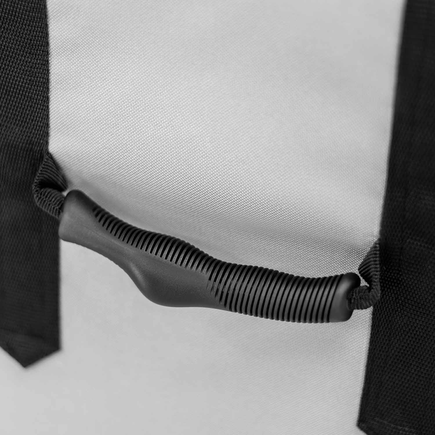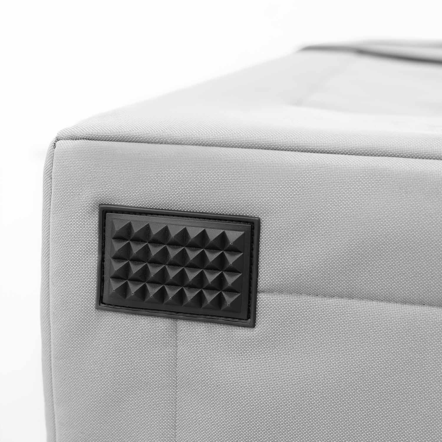 Cusăturile duble întărite asigură o durabilitate ridicată în timpul transportului. Baza este echipată cu șase tampoane de cauciuc care minimizează uzura țesăturii și ajută la prevenirea alunecării husei pe podea.